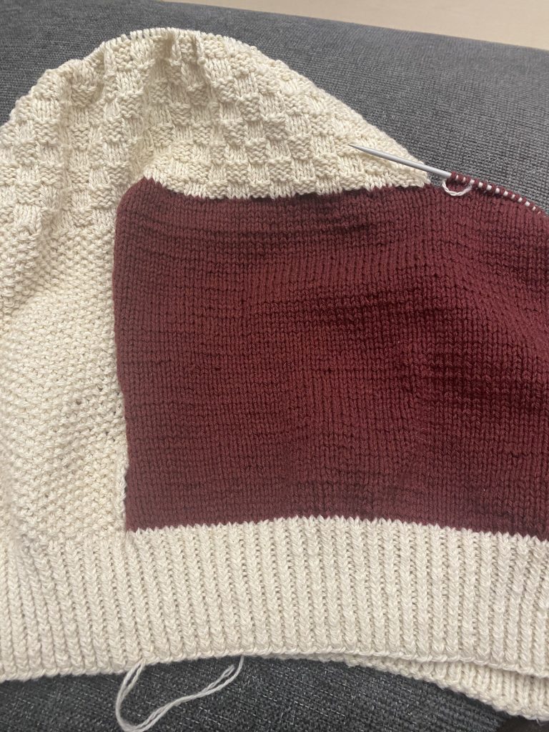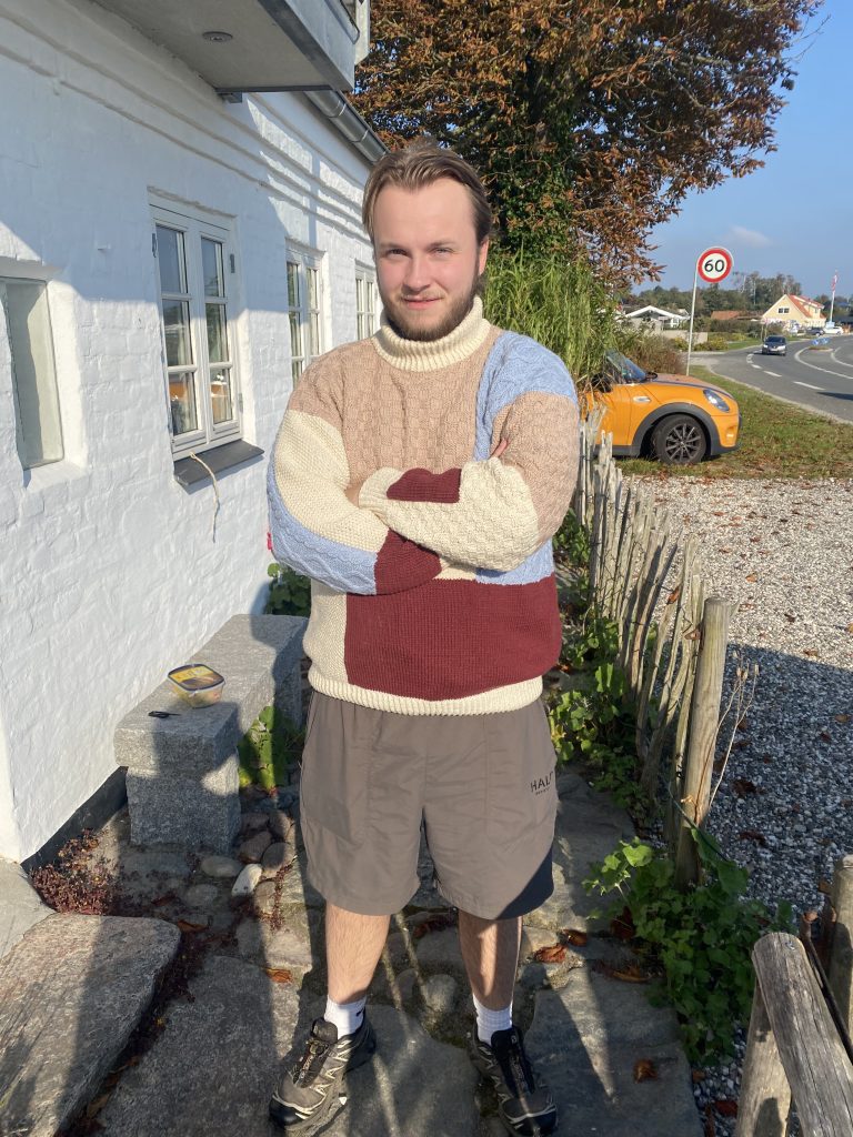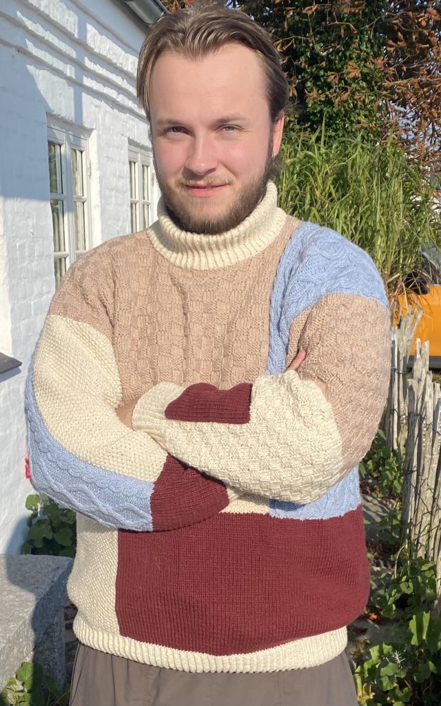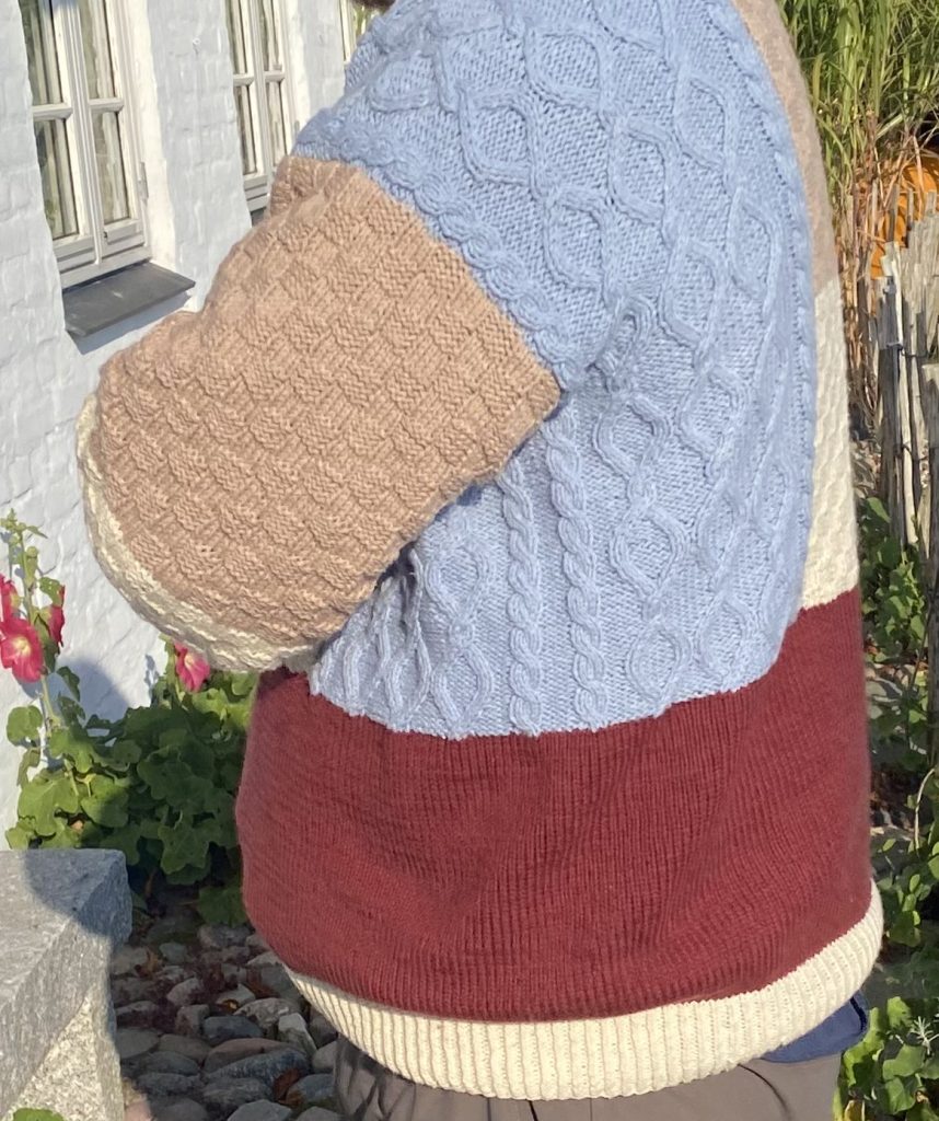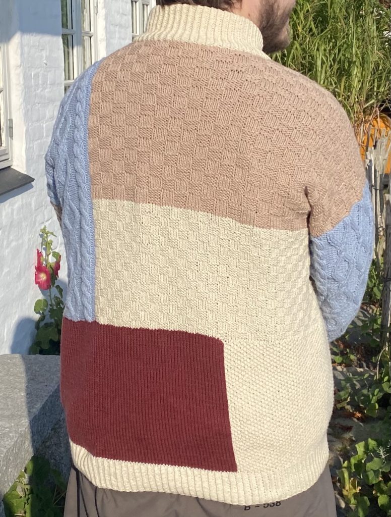 Strikket med inspiration fra billeder på nettet. Albert syntes trøjer med felter af forskellig farve og struktur er flot, og så havde jeg en ide om at det også ville være sjovt at lave. Jeg fandt garn i de nogenlunde foretrukne farve i uld/ bomuld og så lånte jeg målene fra en af yndlingstrøjerne efter vi var enige om forholdene mellem felterne.