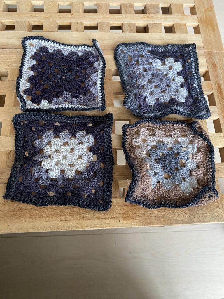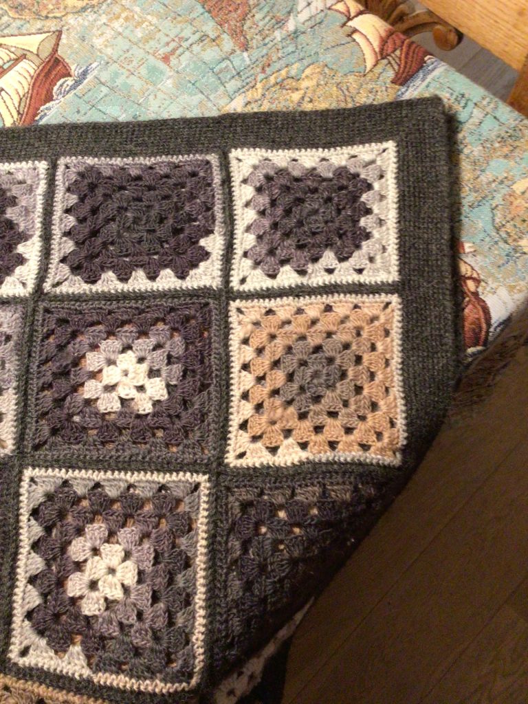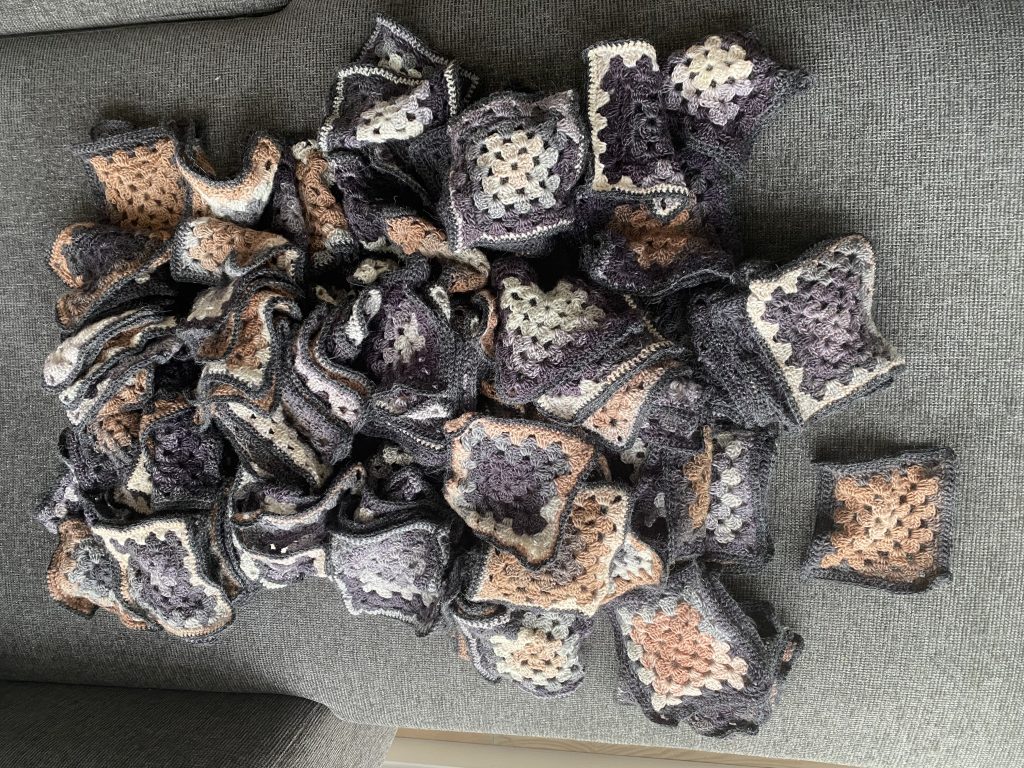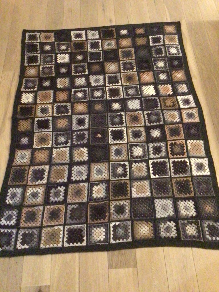 De 140 felter blev blandet godt og hæklet sammen med en rest mørkegrå Alpaca fra reolen. Fortsatte med en ret bred kant i fastmasker til der ikke var mere garn.
