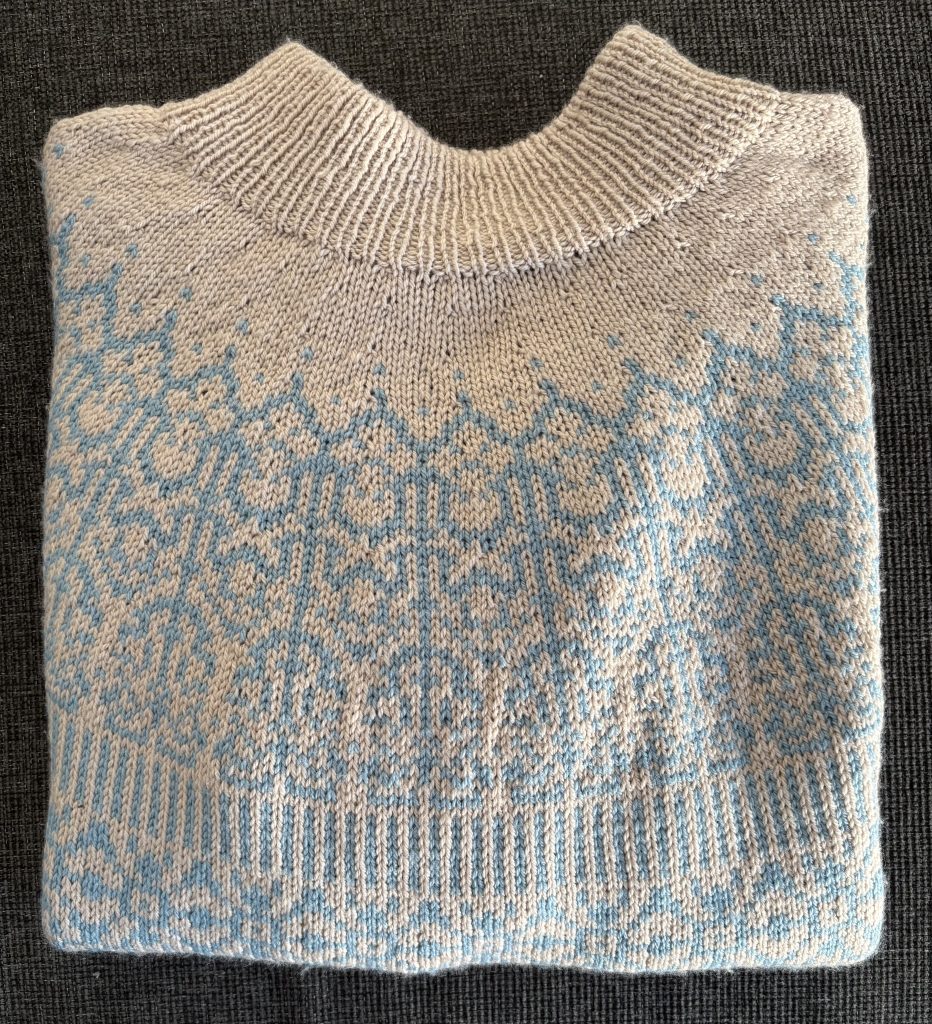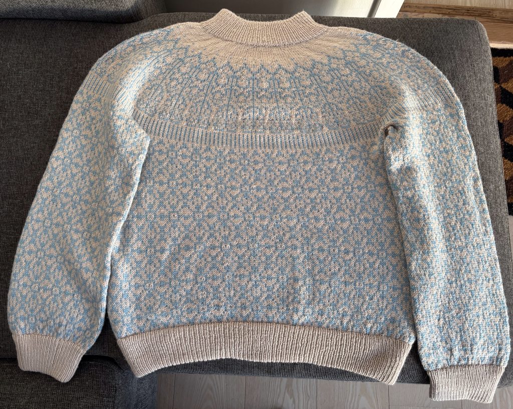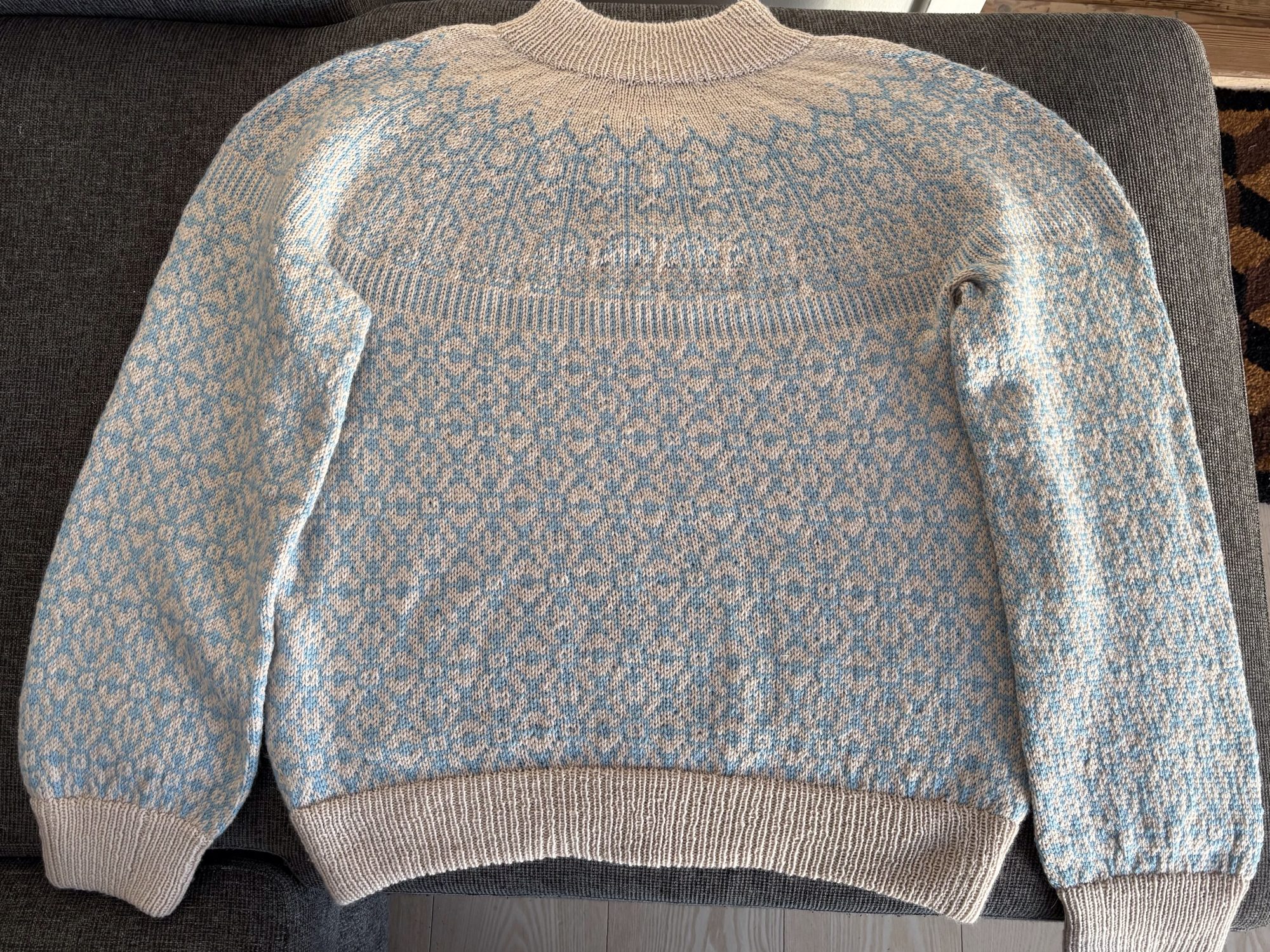Ribben i bunden og ærmerne blev strikket doddelt længde og bukket om for at give lidt tyngde og fordi den er strikket oppefra og aflukning i rib er svært at få pænt.