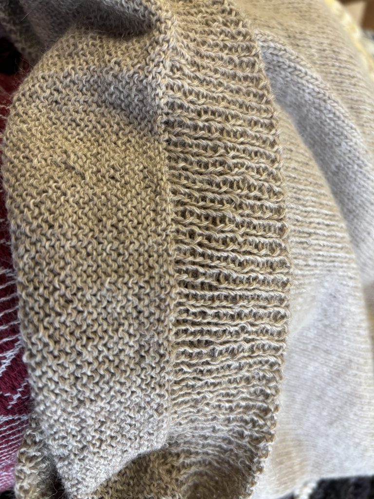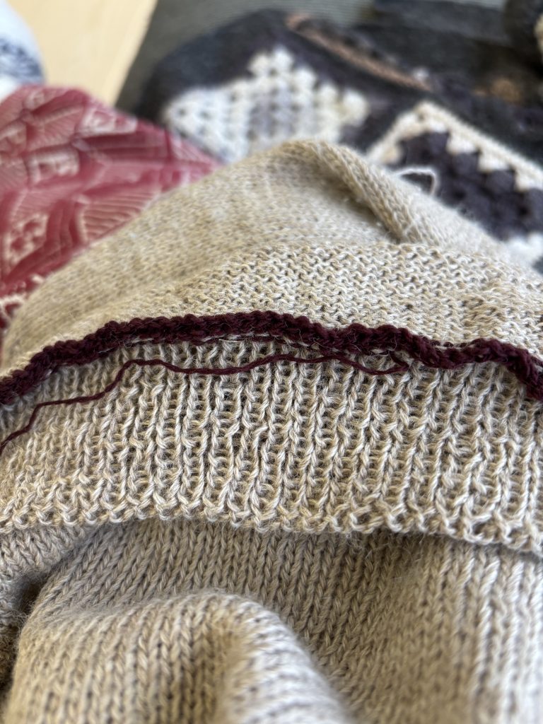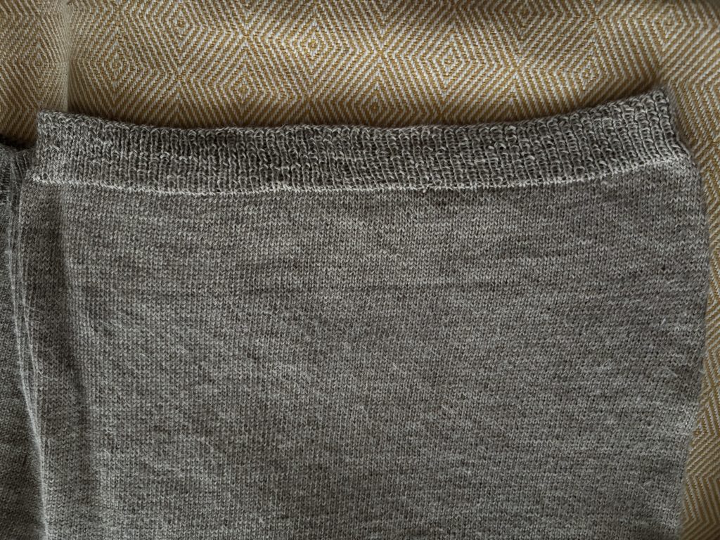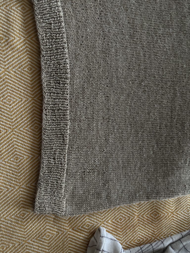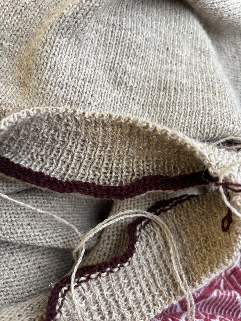 Jeg bliver sjældent tilfreds med ribaflukning oppefra og ned så jeg strikkede ny rib nedefra og syede de to delesammen med kontinuerte maskesting.